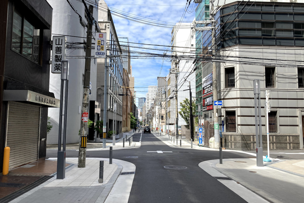 の一連の流れの中で、道修町の無電柱化や周辺景観と調和した道路整備を進めています。