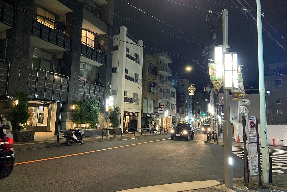 ふわっと優しい柔らかな光で照らしつつ、連続して続く街路灯が華やかさやにぎわいを演出しています。