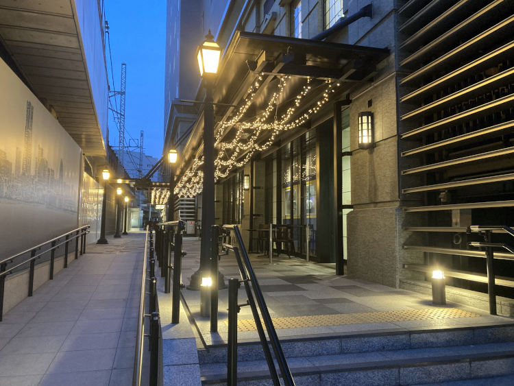 ビル内外のあかりが暖かみのある光で統一され、にぎわいのある魅力的な空間を演出しています。