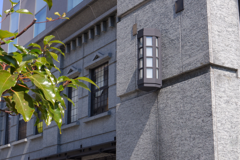 ビルの飾り窓に合わせた格子柄のブラケット照明。