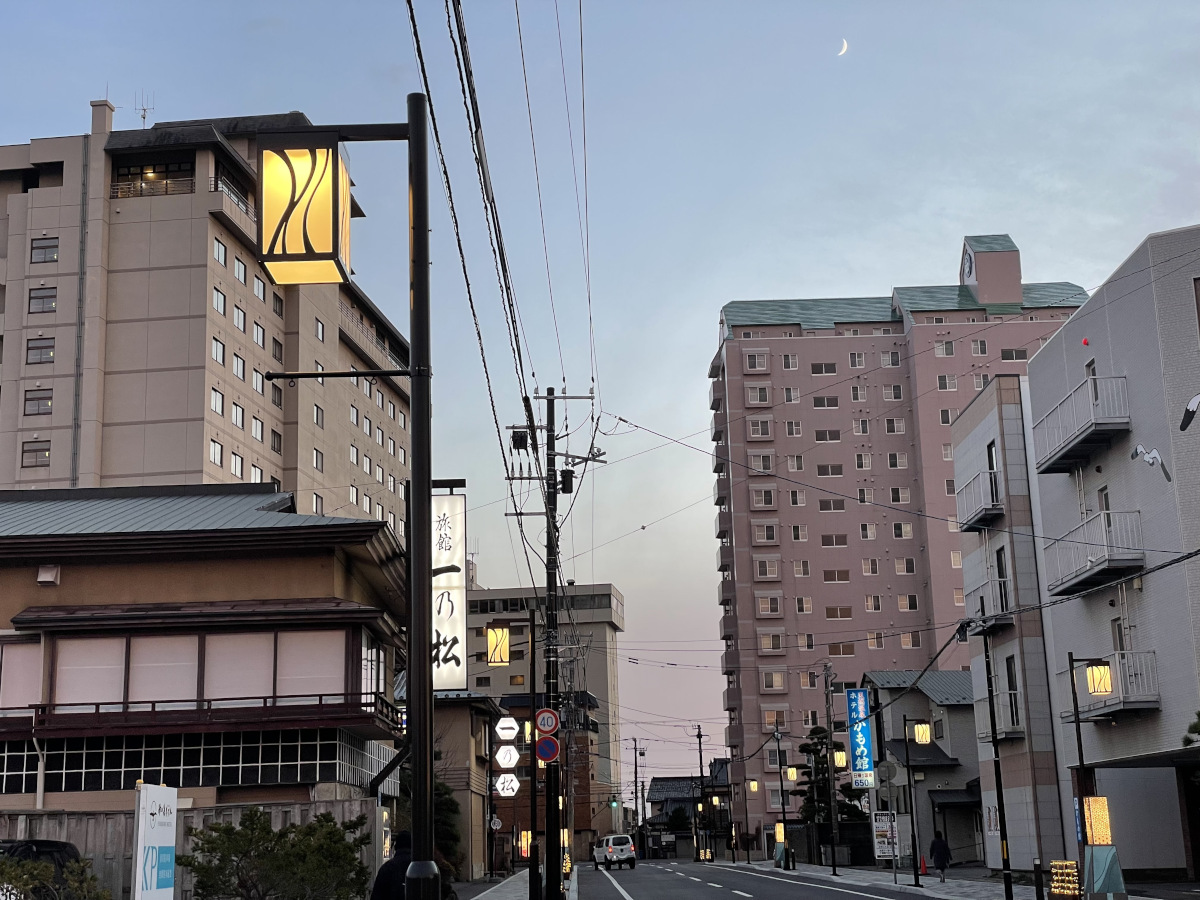 温泉が流れるような流線デザインの和風街路照明は、夕暮れになるとともに温泉街の雰囲気を一層高めてくれます。