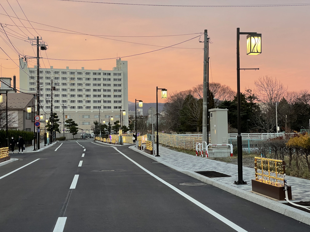 函館市は2020年から湯の川地区の活性化に向けた市道の環境整備に取り組まれており、この整備の一環として市道中環状通のデザイン街路灯を採用いただきました。